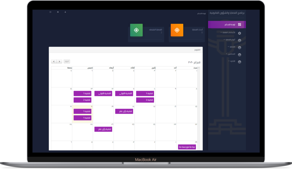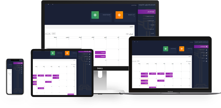 تصميم متوافق مع جميع الشاشات والهواتف ، لوحة تحكم سلسة وسهله الاستخدام تعرض تحليل كامل لكل شئ بالنظام للمراجعة ومنها: أحدث القضايا – القضايا النشطة – تقويم بمواعيد وأحداث كل قضية او ميعاد او جلسة