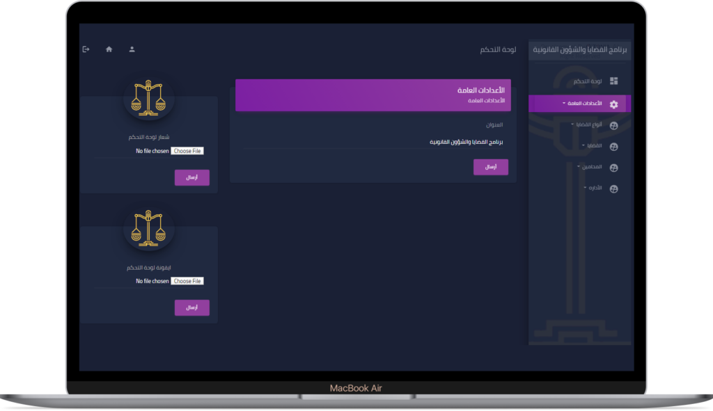 وهي لوحة التحكم الخاصة بإدارة النظام بالكامل والتي تستطيع من خلالها ان تتحكم في النظام بشكل كامل من إدارة القضايا والمحاميين وصلاحيات المديرين وتحديد صلاحيات كل مدير او موظف ، بالاضافة إلى متابعة طلبات القضايا والجلسات الجديدة وإضافة قضية او مشكلة قانونية أو أضافة اي محامي او موظف جديد .