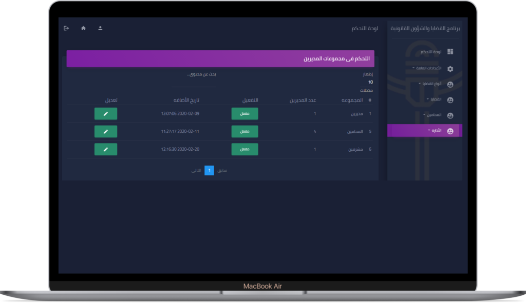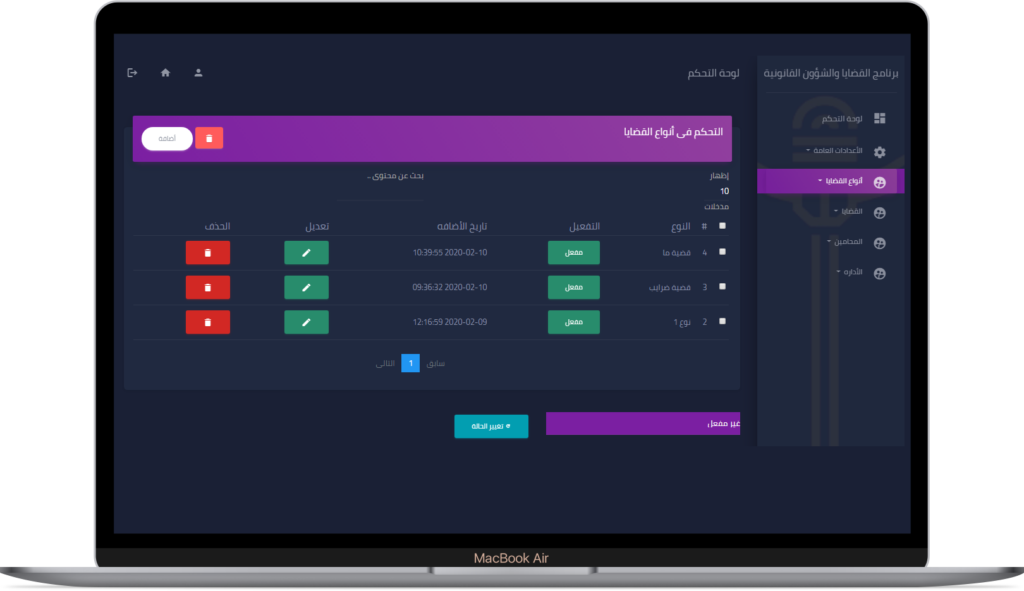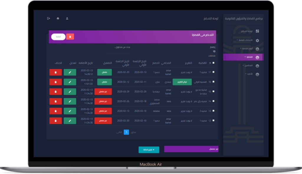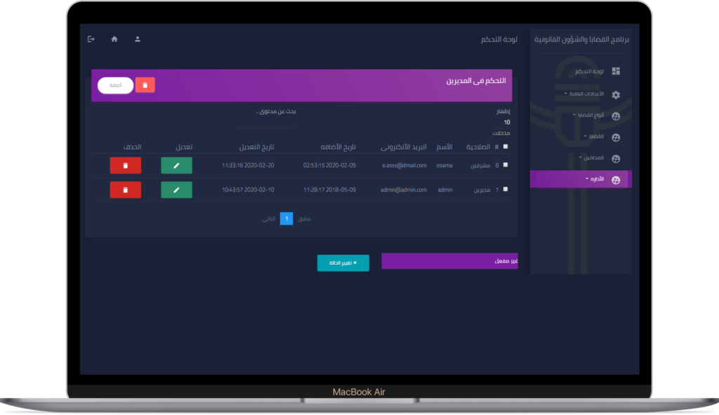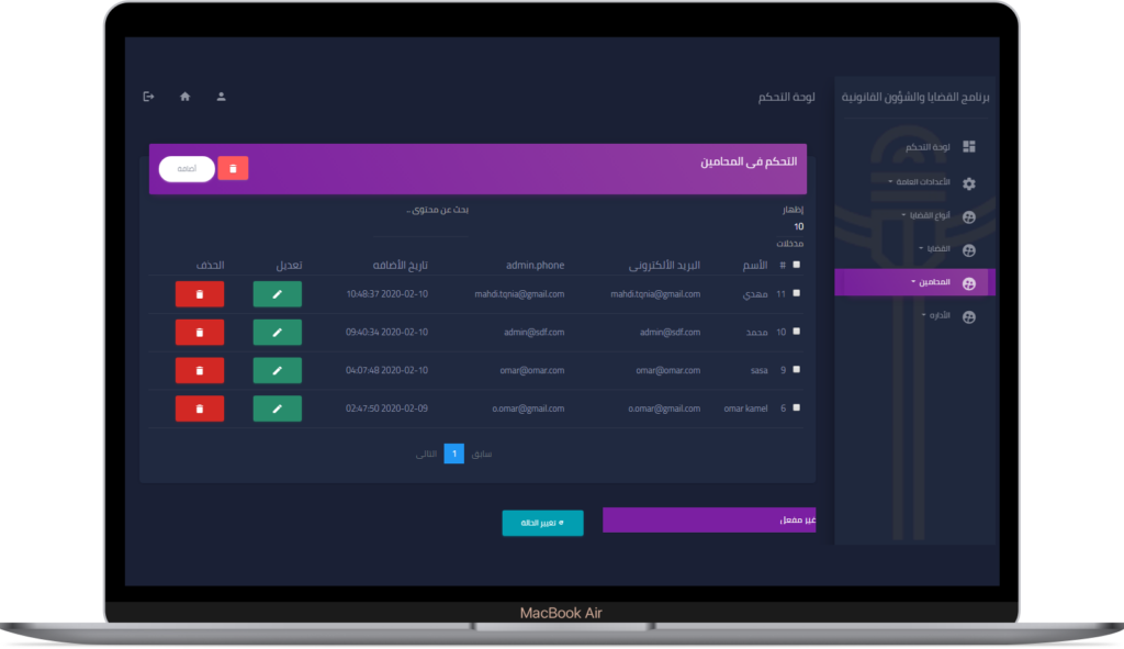 هنا الجزء الخاص بالادارة للمحامي ، حيث يمكننا اضافة او حذف او تعديل بيانات محامي والبحث ضمن المحاميين المتواجدين بالقائمة معنا وتغيير حالة كل محامي ان كان مفعل او غير مفعل ، وتأتي التعديلات كالتالي: إضافة محامي – حذف محامي - البحث ضمن المحامين المسجلين - الاسم – البريد الالكتروني – تاريخ الإضافة – تعديل البيانات للمحامي – تفعيل وتغيير تفعيل الحالة للمحامي