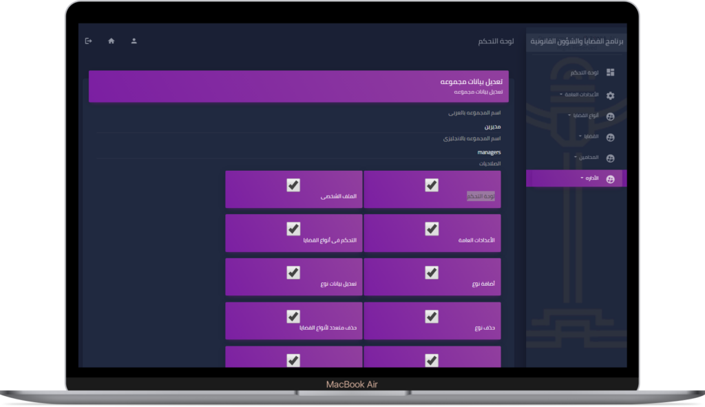 هنا مجموعة من الصلاحيات المتاحة التي يمكن اضافتها لأي ادارة او مدير او محامي او موظف تمكنة علي التحكم في الاتي: لوحة التحكم – الملف الشخصي – الاعدادات العامة التحكم في أنواع القضايا – إضافة نوع – تعديل بيانات نوع – حذف نوع قضية – حذف متعدد لأنواع القضايا – تفعيل متعدد لأنواع القضايا التحكم في القضايا – إضافة قضية – تعديل بيانات قضية – حذف قضية – حذف متعدد للقضايا – تفعيل متعدد للقضايا التحكم في المحامين – حذف محامي – حذف متعدد للمحامين – تفعيل وإلغاء تفعيل للمحامين التحكم في الإداريين – إضافة مدير – تعديل بيانات المدير – تعيل وإلغاء متعدد للمديرين التحكم في مجموعات المديرين – تعديل بيانات مجموعة – تعديل الاعدادات العامة – إضافة مجموعة – حذف مجموعات صلاحيات – حذف متعدد لمجموعات صلاحيات – تفعيل والغاء متعدد لمجموعات صلاحيات